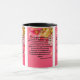 This two-tone mug features an agrandir grand medium print font with black letters displaying the "Isaiah 65:16" KJV bible scripture verse over a pink background showcasing a floral arrangement with multi-coloured flower in this floral style theme. This verse is referencing the Book Of Isaiah 65th chapter showing the 16th verse in this bible scripture quote theme from the King James bible. The rim & handle are glazed in matching colours available in 11-ounce or 15-ounce sizes microwave and dishwasher safe ceramic construction.
