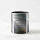 This two-tone mug showcases a design that features a Frutiger print font with navy blue letters silver coloured outline displaying the "Isaiah 8:20" KJV bible scripture verse over this picture of the deep forrest surrounded with trees and the sun shining through in the background of this faith based theme. This verse is referencing the Book Of Isaiah 8th chapter showing the 20th verse in this bible scripture quote theme from the King James bible. The rim & handle are glazed in matching colours available in 11-ounce or 15-ounce sizes microwave and dishwasher safe ceramic construction.