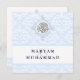 Islamic soft blue background with white ornate damask pattern and a circled calligraphy of Bismillah.