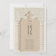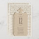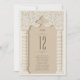 Set a regal tone at your wedding reception with this luxurious table number card, inspired by the intricate artistry of Arabesque design. The card showcases an elaborate ivory arch with swirling patterns reminiscent of traditional Middle Eastern art, set against a rich taupe canvas. The main attraction, a grand table number, is displayed in a deep espresso font that is both bold and elegant. Flanking the arch are two classic columns adorned with a herringbone pattern in shades of ivory and beige, offering a subtle contrast to the smooth taupe background. This card not only serves as a practical guide for your guests but also as a piece of art that enriches the table setting with its cultural beauty and neutral colour scheme.