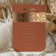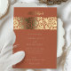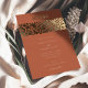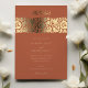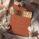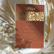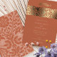 This elegant Islamic wedding invitation features a rich, burnt orange background beautifully contrasted with intricate gold foil floral accents. The front of the card is adorned with a delicate floral pattern and a meaningful Islamic phrase at the top, setting a reverent and sophisticated tone. The back continues the floral theme with a subtle, monochromatic design in warm tones of orange and coral, personalised with initials for a unique touch. This invitation is perfect for couples looking for a blend of tradition and modern elegance, with a vibrant colour palette that embodies warmth and celebration.