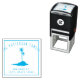 A self inking address stamp featuring an illustration of an island with two palm trees at centre.