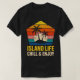 Island silhouette over flat-color pentagon sunset with grunge on text and sunset — perfect for tropical vibes.