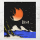Swaying palm trees on island beach with orange moon on a starry night. Custom text