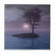 A 3D fantasy scene created in Vue: on a lonely island in the midst of the peaceful sea stands a lamppost with four pale pink glowing lamps. A lone tree with purple-grey leaves, an abandoned little boat, and a passing dolphin are the only other signs of life in this eerie ocean.