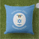 Outdoor pillow for holiday and Hanukkah decor featuring an angel dressed in the blue and white flag of Israel. Designed for families of multiple religions. The Hanukkah Israeli flag angel flies inside a white circle of squiggly squares, surrounded by a background of blue squiggly squares. Add a name to personalise. Customise with the year. Or, add your own text.