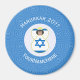Personalised round magnet shows an angel wearing the flag of Israel for holiday or Hanukkah gift giving. Great for kids. The Israeli Flag angel is found inside a white, fractal circle of squiggly squares. The background is a blue fractal of squiggly squares. Add your own text or personalise with a name, holiday, and the year. Cool stocking stuffer for families of multiple religions.