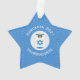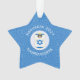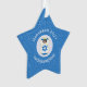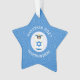 Star shaped ornament for holiday and Hanukkah decor featuring an angel dressed in the blue and white flag of Israel. Designed for families of multiple religions. The Hanukkah Israeli flag angel flies inside a white circle of squiggly squares, surrounded by a background of blue squiggly squares. Add a name to personalise. Customise with the year. Or, add your own text.