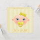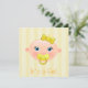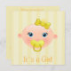A sweet baby shower invitation in yellow shades, a cute girl baby face with a pacifier and a bow on a yellow pastel striped background.