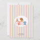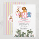 IT'S A GIRL is an adorable baby shower invitation that has a baby zoo animal theme. This fun design features a monkey, giraffe, lion and elephant in the main title. At the bottom of the invitation, there are palm trees and green foliage. On the back of the invitation, there is a pink and yellow striped pattern, over a grey background.