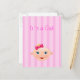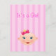 A cute birth announcement in pink shades, a cute girl baby face with a bow on a pink pastel striped background.