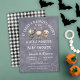 Spooky-cute gender neutral Halloween baby shower invitation with the quote "It takes a haunted village to raise a little monster". Featuring 3 adorable baby toys, teddy bears, and creepy spider webs on a grey watercolor style background. Includes a black and white chequered pattern on the back of the invite. This invite sets the tone for a fun and eerie fall celebration honouring the mum-to-be. Fully customisable with name, date, event details, and rsvp information. Great for families planning a festive boy or girl baby shower in October.