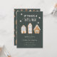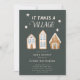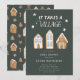 Rustic and modern Christmas theme baby shower for a boy featuring hand drawn illustration of gingerbread houses with blue frostings. The text says "it takes a village."