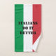 Italian flag of Italy funny custom text hand towel. Humor gift for him or her. Fun Christmas or Birthday presents for friends, family, girlfriend, boyfriend, husband, wife, coworker, boss, employee, teacher, mom, dad, brother, sister, etc. Tricolore flag. Italian pride design. Italians do it better! Also available as whole set with wash cloth and bath towel. Add your own humorous quote, name or monogram letters.