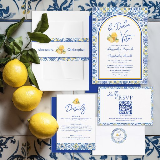 Celebrate your Italian summer destination wedding with a chic La Dolce Vita themed invitation. Featuring Mediterranean tiles in blue, white, and yellow, this elegant design is accented with a trendy arch, fresh lemon gelato illustration and script calligraphy. Inspired by Positano and the Amalfi Coast, it captures the romance and joy of a sun-soaked seaside celebration and sets the perfect tone for a stylish Mediterranean wedding. Please contact me if you have any requests for custom products.