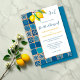This elegant italian-mediterranean wedding invitation features ceramic tiles and watercolor illustration of fresh citrus juicy branch of lemons painting with a beautiful mediterranean blue backing.