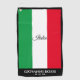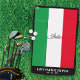Italy golf towel with Italian flag colours red, white, and green and black trim with bottom name and extra text for a birthday or anything you choose. Perfect gift for Italian golfers. Customise the text for a personalised gift.