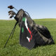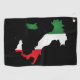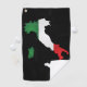 Italy golf towel with Italian flag colours red, white, and green and country map of Italia. Black background. Perfect Italian golfers.
