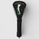 Italy golf head cover with a female golfer silhouette in Italian flag colours red, white, and green. Black background with customisable name text. Perfect gift for Italian golfers. Viva l'Italia!