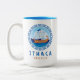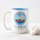 Ithaca, Greece two-tone coffee mug with a design of an ancient Greek ship and Greek style lettering. This Ancient Greece ship design has the Greek key in a circle design with the sea and sky. This Greek style design makes this mug an ideal gift or souvenir or to drink coffee in while you are on vacation in Ithaca island.