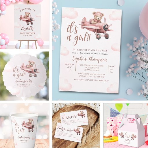 Celebrate the arrival of that cute little bear with this cute girl baby shower design. Featuring a beautiful image of a cute bear piloting a little plane and the cheerful phrase “It’s a girl,” this design is the perfect style to set a cheerful and whimsical tone for your event. For complementary products, check out the collection of this cute girl baby shower design.