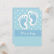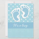 This baby shower invitation features a design of two blue baby footprints, on a varied blue and white polka dot background. The centre stripe has stitching details, and customisable "It's a boy" text. The blue background on the back, and informational text, can be customised as desired.