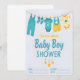 The cheerful teal and sunny yellow color scheme creates a perfect gender reveal / baby shower vibe. Below the hanging clothes, elegant script reads "Join us to celebrate Baby Boy SHOWER" with hanging yellow stars for extra cuteness