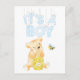 Adorable typography, "It's a Boy" baby shower design featuring a cute teddy bear with a barrel of honey watching a cute honey bee. The fun blue lettered typography is strung at top with cute strings and dangle down. Blue florals and templates to create your own invitation on back.