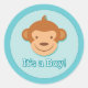 A cute cartoon monkey in a circle with a blue backdrop announcing it's a boy!