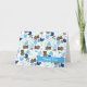 A boy baby shower thank you card featuring a pattern consisting of bears, bundles, diaper pins, strollers, and "It's A Boy!" with a blue colour scheme.