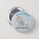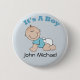 Customise this blue button with baby's name. Button has a crawling baby in a diaper and t shirt. It's a boy is written at the top. Great for baby shower party favours