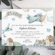 Celebrate the upcoming arrival of a baby boy with this cute baby shower invitation featuring a blue aeroplane flying over the town with a banner announcing "It's a Boy!". Puffy clouds, birds and stars fill the sky in this watercolor storybook scene to celebrate the happy occasion. Personalise the sample text with your baby shower details.