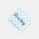 This baby shower napkin features a pastel blue and white gingham check background, evoking a sense of southern charm. The message "it's a boy" in stylish cursive lettering ensures the napkin is eye-catching while maintaining an air of casual elegance. The napkin reflects a classic preppy yet contemporary feel, suitable for celebrating the mum-to-be with a timeless design.