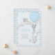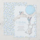 A little bunny is on his way pregnancy announcement! The design is framed with ditsy blue flowers and features a sweet little bunny with a small bouquet and a blue balloon flying a banner, lettered with IT'S A BOY, and decorated with a little bird. This cute card has a gentle blue colour pallette and the back of the pregnancy announcment has the same whimsical floral pattern.