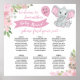 This adorable 6 table seating chart is designed for a baby shower welcoming a baby girl. The artwork features hand painted watercolor florals in shades of blush pink, with a cute baby elephant holding a balloon that reads "It's a Girl!"