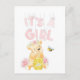 Adorable typography, "It's a Girl" baby shower design featuring a cute teddy bear with pink floral and a barrel of honey watching a cute honey bee. The fun pink lettered typography is strung at top with cute strings and dangle down. Pink florals and templates to create your own invitation on back.