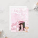 A light pink, watercolor-style background. A gold, thin, rectangular frame is centred within the image. Pink, cartoon-style balloons with the word "GIRL" spelled out in balloon letters are clustered within the frame's left quadrant. A small, light brown teddy bear, dressed in a light pink shirt and shorts, is in the bottom-right quadrant of the frame. The background has soft, diffused pink washes and a subtle marbling effect. Small, pink hearts and stars are scattered around the frame. Available as printable invitations or instant downloads.