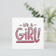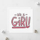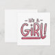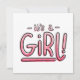 A card design depicting the phrase "it's a girl!" in a quirky handwritten font. The letters are coloured with a pink gradient and are accompanied by an off-centre, bold, black outline to make the colours pop. The design sits on a simple, but effective, white background.
