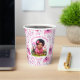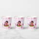 Cute it's a girl baby shower paper cups with a cute African-American baby girl with a pink flower in her hair, Pretty pink floral background with pink and green text.
