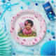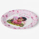 Cute it's a girl baby shower paper plates with a cute African-American baby girl with a pink flower in her hair, Pretty pink floral background with pink and green text.