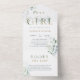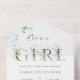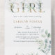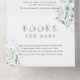 This all in one baby shower invitation card features painted watercolor eucalyptus, green leaves, and botanical gold letters with a book request card. For more advanced customisation of this design, please click Customise Further link to change font, size, and colour.