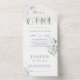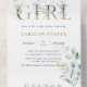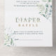 This all in one baby shower invitation card features painted watercolor eucalyptus, green leaves, and botanical gold letters with a diaper raffle card. For more advanced customisation of this design, please click Customise Further link to change font, size, and colour.