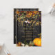 Beautiful rusty orange and dark burgundy autumn fall flowers with dried leaves and foliage, a little stork carrying a baby girl in a pink blanket and a watercolor pumpkin over a dark brown barn wood background with strings of golden twinkle lights making a charming elegant baby girl shower party invitation with a trendy handwriting gold "It's a girl!" typography script. +++++++++ Easy to personalise with your details! Suitable for traditional autumn fall rustic | country | farmhouse | outdoor backyard girl baby shower.