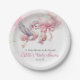 Celebrate your baby girl with this charming paper plate featuring a watercolor stork delivering joy on a fluffy pink cloud tied with a soft satin bow. The elegant pastel artwork creates a whimsical and heartwarming setting, perfect for themed baby shower parties. Pair it with matching decor for a cohesive, unforgettable celebration.