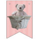 Adorable baby shower bunting banner is perfect for celebrating the upcoming arrival of the new baby girl! Bunting features alternating designs of pink and white stripes background with text in big bold white font that says It's a Girl! and the same pink and white stripes background with a cute neutral beige teddy bear sitting in a wicker basket with neutral beige ribbon! Matching It's A Girl Teddy Bear Pink Stripes Baby Shower invitations, paper plates, etc. also available!