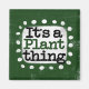 "It's A Plant Thing" is a cute text design in green with black and red text, along with a white accent shape and white textured whimsical dots surrounding it.