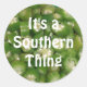 Photograph of cut okra filled to edges of sticker with the words "It's a Southern Thing" printed on top.