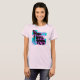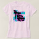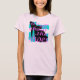 This design is for women who love shoes. A platform stiletto is on a geometric background. The slogan is written across the background and the shoe. Designed in medium blue, black, and fushcia, it works well on most colours.