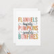 This colourful and fun fall design features a list of autumn favourites, including "Flannels," "Hayrides," "Pumpkins," "Sweaters," and "Bonfires." The text is presented in a bold, uppercase font with each word filled in with a different warm, earthy hue—ranging from soft pinks and oranges to muted greens and blues—perfectly capturing the cosy and vibrant spirit of the season. The words "hayrides" and "sweaters" are written in a flowing script, adding a touch of elegance and creating a nice contrast with the bold block letters. Decorative flourishes frame the script text, adding to the overall charm and appeal. This design is perfect for fall.