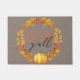 Welcome visitors with a welcome to the change of season with this linen look 'It's Fall Y'all' Rustic Pumpkin Leaf Autumn Doormat. The greeting 'It's Fall Y'all' appears in pumpkin and black handlettered typography, surrounded by a lovely fall wreath of golden leaves, berries and anchored by a pumpkin at the bottom.